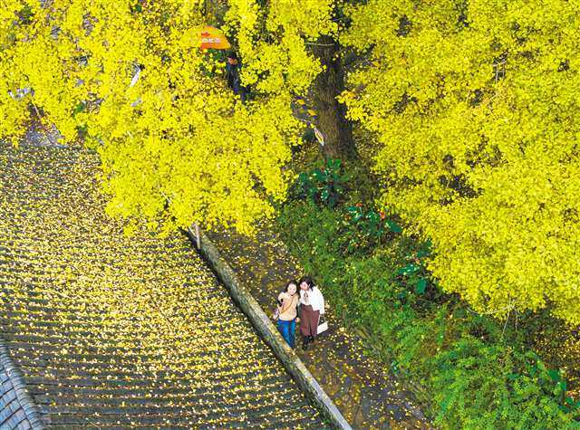11月8日,搭客在南川区德隆镇银杏村拍照打卡(无东谈主机像片)。