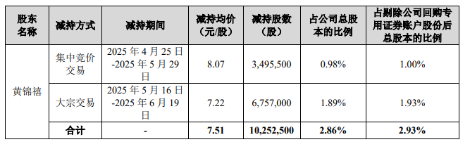 黄锦禧共计减执1025.25万股,减执均价7.51元/股,共计套现7699.63万元。