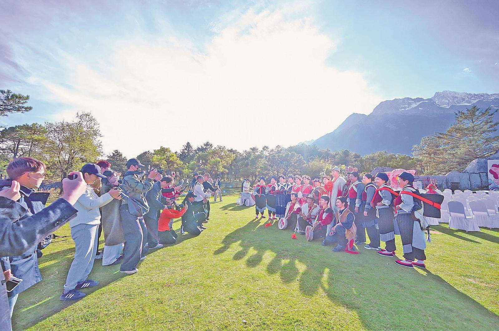 11月9日,在推介活动现场,新东说念主与纳西族婚俗展演团队合影。 (供图)