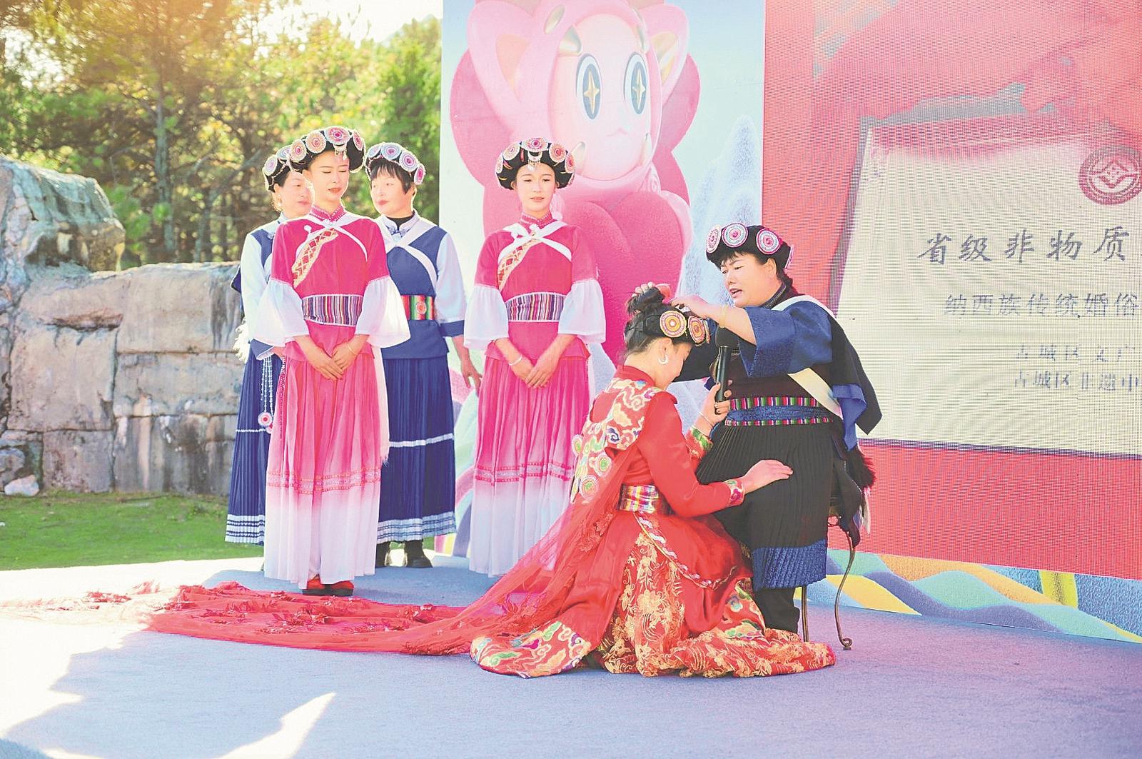 11月9日,在推介活动现场,纳西阿妈边为新娘梳头,边唱《嫁女调》。 (供图)