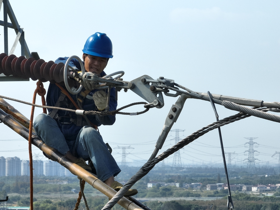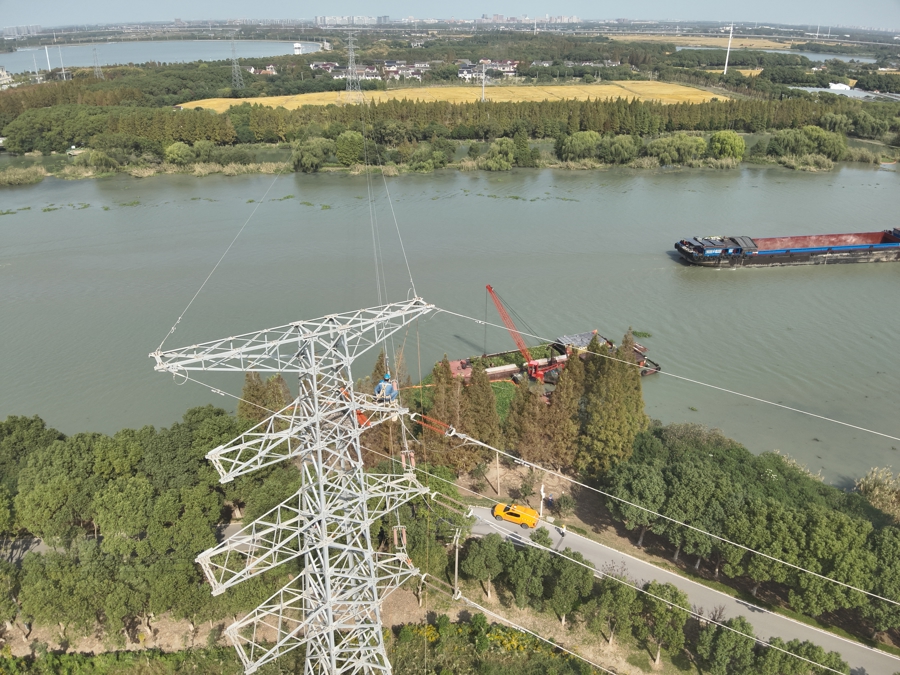 国网上海青浦供电公司运检部责任主说念主员在杆塔上施工