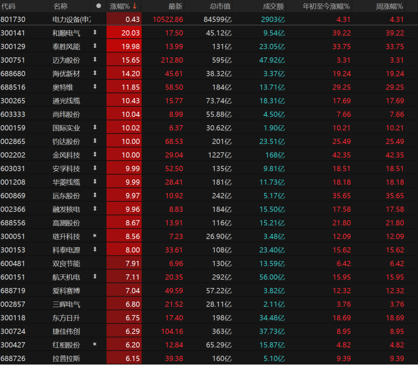 11只电力拓荒个股涨停,温柔电气、泰胜风能“20cm”涨停,尚纬股份、国际实业、钧达股份、金风科技、安孚科技等涨停。