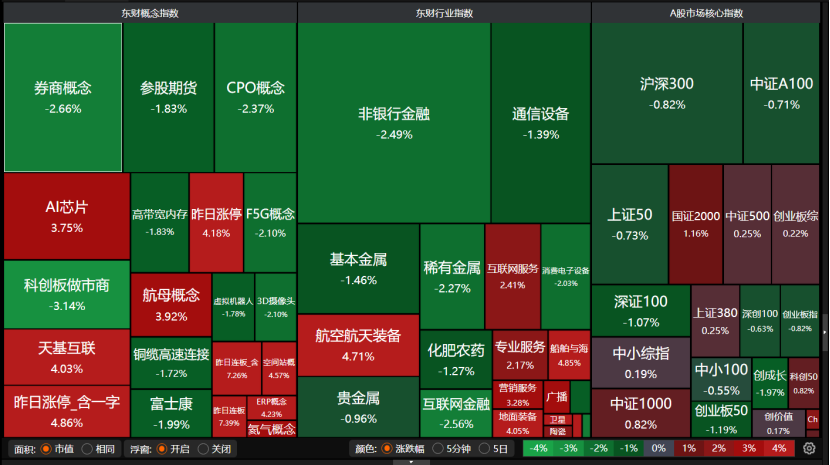 盘面上,券商成见、CPO成见、虚构机器东谈主、颐养金属、消耗电子拓荒均回调。AI芯片涨势可以,航母成见、航空航天装备昂首。
