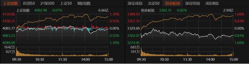 本日延续窄幅轰动,指数跌多,但个股涨多。沪指微跌0.07%报4082.98点;创业板指收跌0.82%报3302.31点,深证成指收跌0.51%。科创50、北证50涨近1%,沪深300、上证50跌近1%。