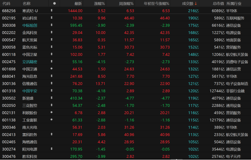 市集所有3731只个股收涨,涨停股111只;1595只个股收跌,跌停股6只。本日成交额进取100亿元的有21只个股,寒武纪-U日成交额216亿元,收涨3.52%报1444元/股;岩山科技、金风科技涨停。中国卫星收涨1.77%报102元/股,雷科防务收涨5.86%报17.69元/股。