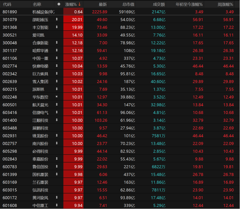 24只机械拓荒个股涨停,邵阳液压、丰立智能“20cm”涨停,中国一重、中意电梯、雪东谈主集团、锋龙股份、展鹏科技等个股均涨停。