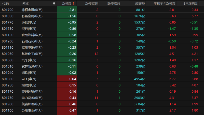 非银金融板块出现较大回调,有色金属、通讯、银行、食物饮料走弱。
