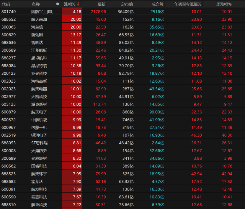 12只国防军工个股涨停,航天南湖、海兰信“20cm”涨停,海特高新、航天电器、天箭科技、派克新材、航天电子、中航机载等个股涨停。